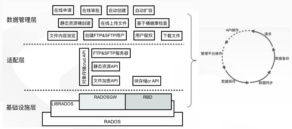 在经过多种类(Ceph、GlusterFS和HDFS)和多维度选型之后,我们选择以Ceph为基础进行云存储建设。在分析了业务特点和使用场景后,也确定了要自开发的功能。愿景是将云存储建设成为一站式服务平台,所有与数据相关得服务均可在该平台完成,也包括存储空间的生命周期流转,实现有求即有,来之即用,用完即走得愿景。如下: