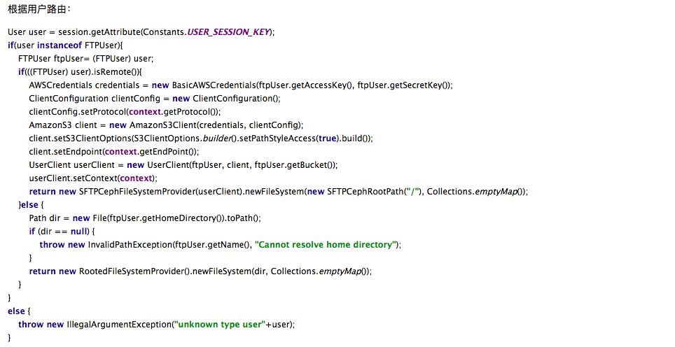 因为业务场景要求,我们利用开源的Apache Commons VFS和Ftp Server自研了FTP和SFTP Server功能,连接对象存储和文件系统。在访问入口处部署了路由功能,让广大商户有选择的从存储某区域上传下载文件,最终达到控制用户使用哪种协议(FTP或SFTP)在哪些区域(文件系统或桶)进行指定操作(上传或下载)的目的。