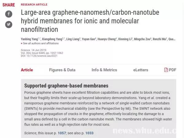 6月14日, Science (《科学》)在线发表了武汉大学化学与分子科学学院在纳米孔过滤薄膜领域的最新研究成果。论文题为“Large-area graphene-nanomesh/carbon-nanotube hybrid membranes for ionic and molecular nanofiltration”(《大面积石墨烯纳米筛/碳纳米管薄膜在离子和分子纳滤中的应用研究》),第一署名单位为武汉大学,武汉大学化学与分子科学学院2014级博士生杨雁冰和2015级硕士生杨向东为共同第一作者,武汉大学化学与分子科学学院袁荃教授、加州大学洛杉矶分校段镶锋教授为通讯作者。