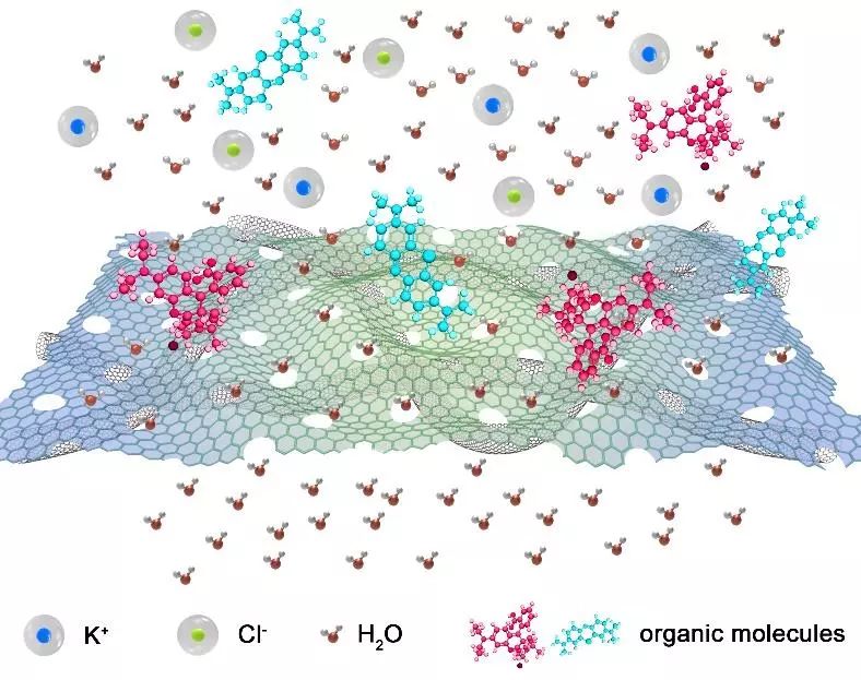 石墨烯纳米筛/碳纳米管纳滤膜选择性分离示意图