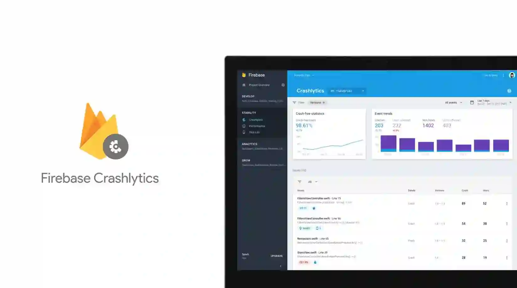 无论您是要开始新的开发,还是希望扩展现有的应用程序,我们都在这里为您提供帮助,以便您可以集中更多时间和资源为用户提供价值。自从与 Fabric 团队合作以来,我们最近将 Crashlytics 带入 Firebase,成为我们的崩溃分析报告王牌产品,帮助您监控和修复应用程序崩溃和错误。