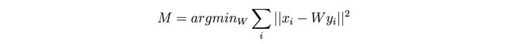 我们利用矩阵将嵌入投影到共同空间。该矩阵被用于最小化词嵌入 x_i 和它的投影 y_i 之间的距离。即,如果词典由(x_i,y_i)对构成,我们需要选择投影器 M,使得: