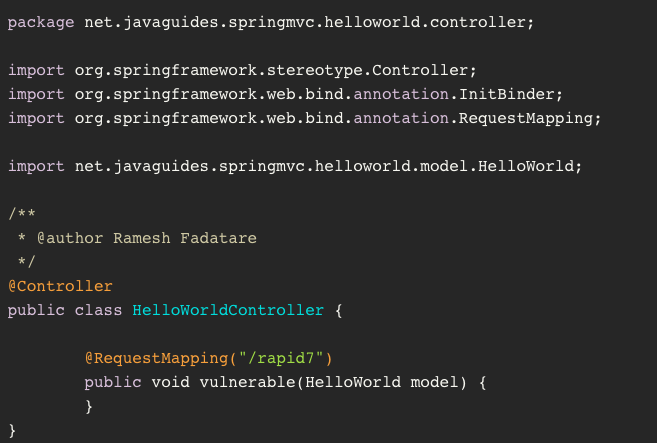 这里有一个控制器 ( HelloWorldController),当它被加载到 Tomcat 中时,它将为 http://name/appname/rapid7 中处理 HTTP 请求。处理请求的函数被称之为 vulnerable,而且还有一个 POJO 参数 HelloWorld。在这里,HelloWorld 被简化了,但如果需要,POJO 可能会变得非常复杂 :