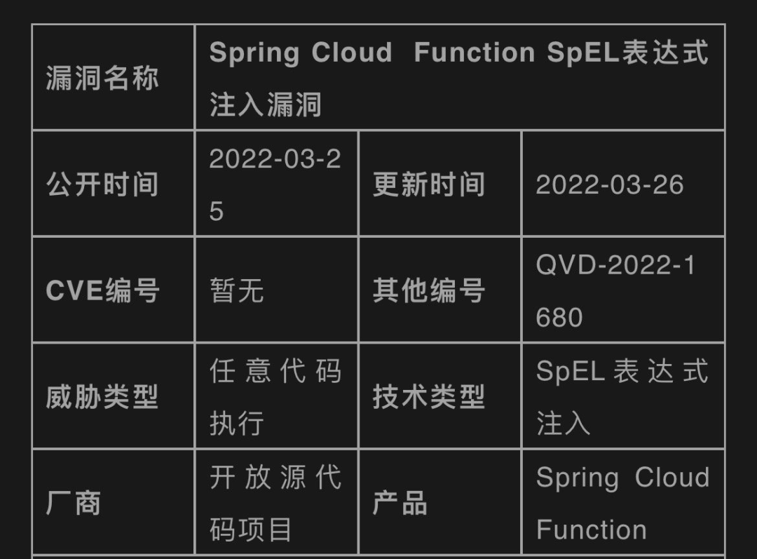 3 月 26 日,据网络安全网站 Cyber Kendra 报道,Spring Cloud Function 官方测试用例曝光了 Spring Cloud Function SPEL(Spring Expression Language)表达式注入漏洞,黑客可利用该漏洞注入 SPEL 表达式来触发远程命令执行。
