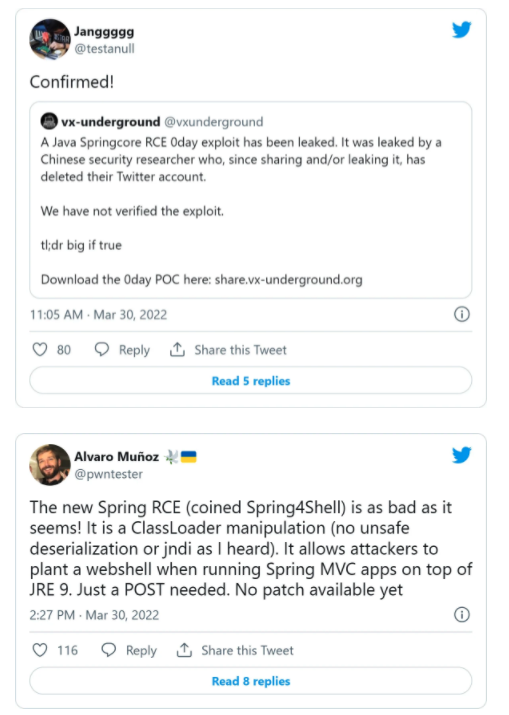 目前,随着该网传漏洞的暗流涌动,国外不少网络安全研究人员和安全公司也发布 Twitter 表示这一漏洞的存在: