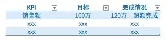 此时,可以选用数字和表格来呈现,比如做一个KPI(关键绩效指标)、目标数据与实际完成情况的Excel表格: