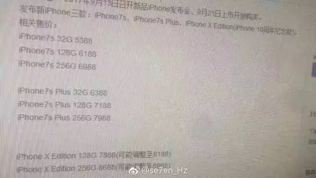 iPhone 8(iPhone X Edition)的起始价格可能会调整至8188元。