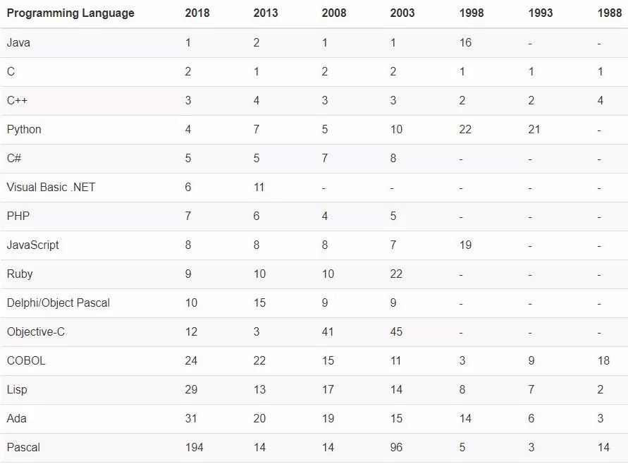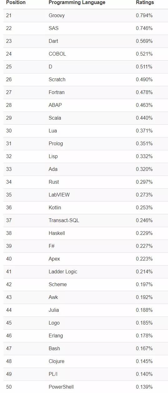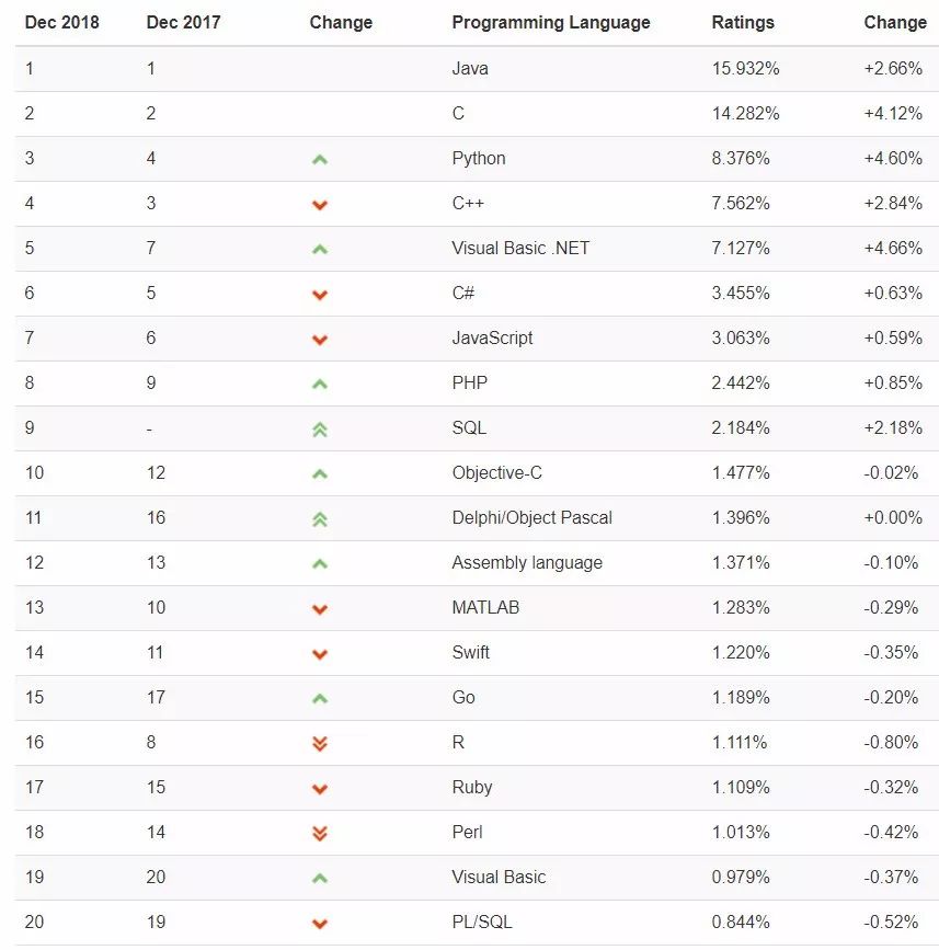 注意:SQL 自 2018 年 2 月起被重新添加到了 TIOBE 排行榜中,由于没有以往的数据可以对比,增长速度非常快,现在位居第 9 名。