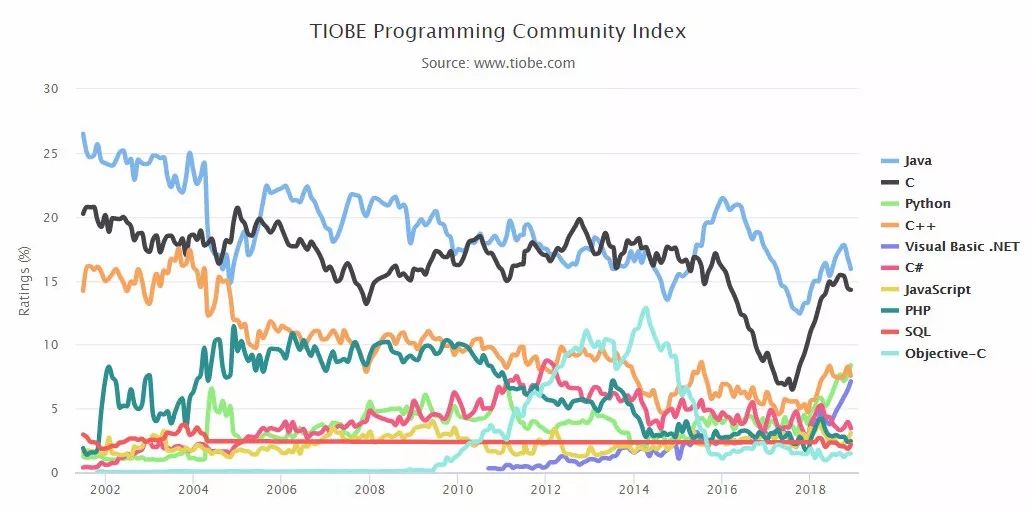 Top 10 编程语言 TIOBE 指数走势(2002-2018)