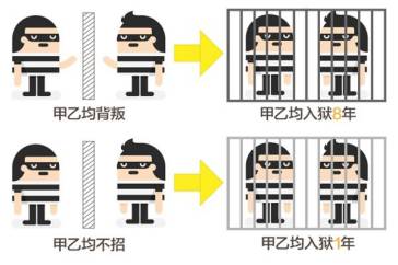 劫匪被分开审讯,每个人都可以招供或拒绝认罪。警察告诉劫匪们,如果他们一个招供而另一个拒不认罪,他们便会将不认罪者视为主犯,并将认罪者当作证人。拒绝认罪者将被判处20年监禁,而招供者会被释放。如果二人都拒绝承认抢劫的罪行,他们将会因为逃税被判4年监禁。如果二人都认罪,他们将因为抢劫罪判处10年有期徒刑。