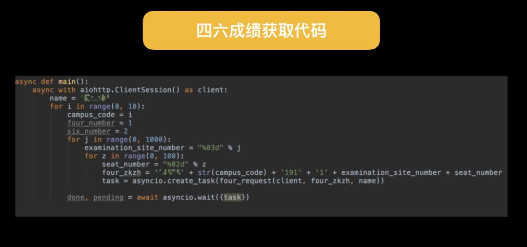 知道学校名称,拥有了学生名单,明白准考证号组成规则,只需几行代码我们就可以去撞任意一位学生的四六级成绩。