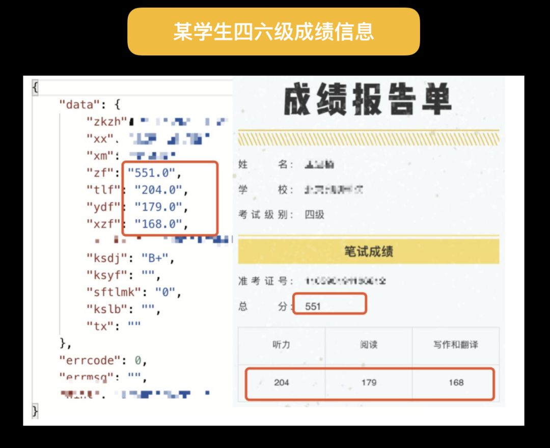 根据公开信息显示,2018 年全国高考报名人数 975 万,录取率 81.13%,新生人数 791 万。只要这 791 万新生,有人参加了今年的四六级考试,花点时间他们的四六级成绩,都可以被人查到。不用黑掉任何网站的后台,只需要通过网上公开信息,就可以拿到百万考生的四六级成绩。