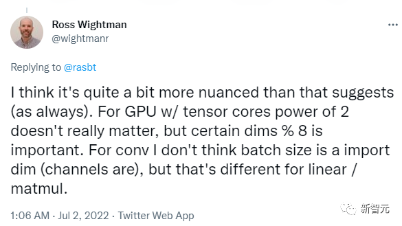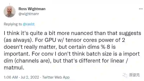 Ross Wightman 曾提到,他也不认为选择batch size为 2 的幂会产生明显的差异,但选择 8 的倍数对于某些矩阵维度可能很重要。