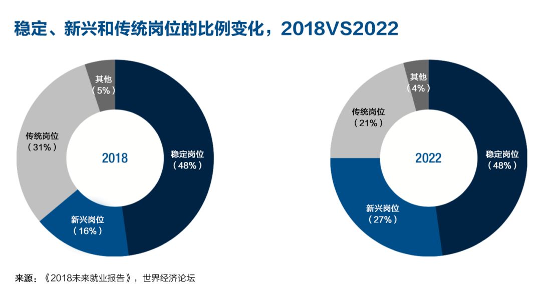 接受调查的公司总共有1500多万名员工,这些公司目前估计将减少98万个工作岗位,增加174万个工作岗位。到2022年,由于人机劳动分工变化,7500万个工作岗位可能被取代,同时有1.33亿个新岗位出现,这些新岗位更适应新的劳动分工。然而这些预测和其背后的假设应谨慎对待,主要是因为它们仅反映全球就业市场变化的一小部分,代表着劳动力转型变化的两面: