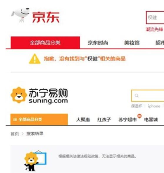 据澎湃新闻报道,12 月 27 日,在京东、苏宁两个平台上已经无法找到权健相关产品。而到了 12 月 28 日早晨,雷锋网在搜索后发现,阿里巴巴旗下的天猫、淘宝等平台也无法搜索到权健的保健产品。