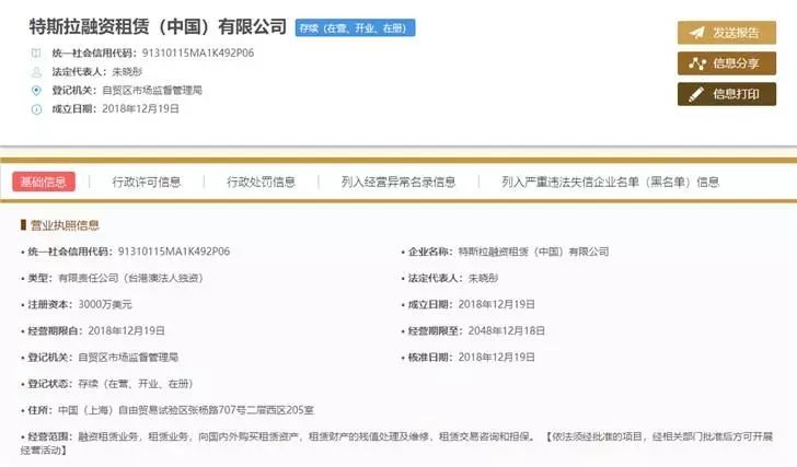 12 月 27 日晚间,据 21 世纪经济报道的消息,特斯拉已经于 2018 年 12 月 19 日在上海自贸区注册“特斯拉融资租赁(中国)有限公司”。来自工商系统的信息显示,这家公司注册资本 3000 万美元,股东为特斯拉汽车香港有限公司;公司法定代表人、董事长为朱晓彤,公司监事为白珊珊。