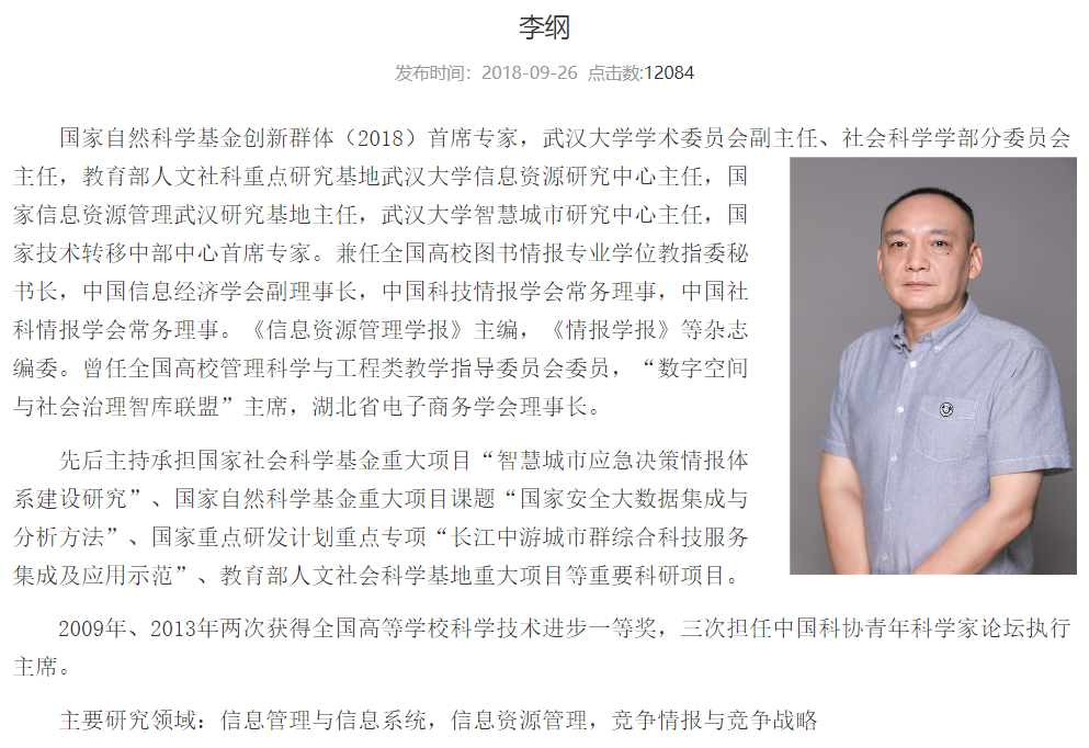 李纲,男,国家自然科学基金创新群体(2018)首席专家,武汉大学二级教授,学术委员会副主任、社会科学学部分委员会主任,教育部人文社科重点研究基地武汉大学信息资源研究中心主任,国家信息资源管理武汉研究基地主任,武汉大学智慧城市研究中心主任,国家技术转移中部中心首席专家。兼任全国高校图书情报专业学位教指委秘书长,中国信息经济学会副理事长,中国科技情报学会常务理事,中国社科情报学会常务理事。