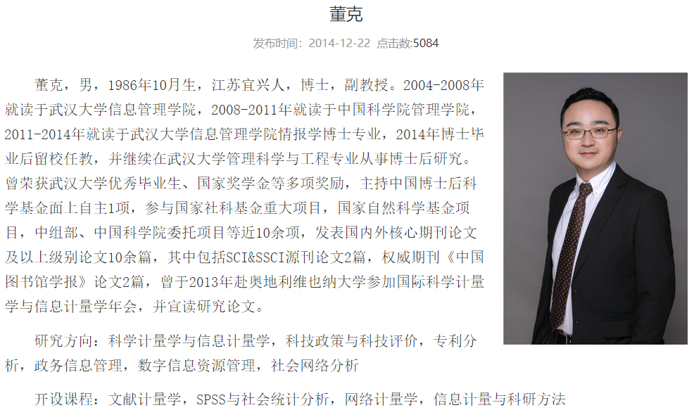 董克,男,1986年10月生,博士,副教授。2004-2008年就读于武汉大学信息管理学院,2008-2011年就读于中国科学院管理学院,2011-2014年就读于武汉大学信息管理学院情报学博士专业,2014年博士毕业后留校任教,并继续在武汉大学管理科学与工程专业从事博士后研究。