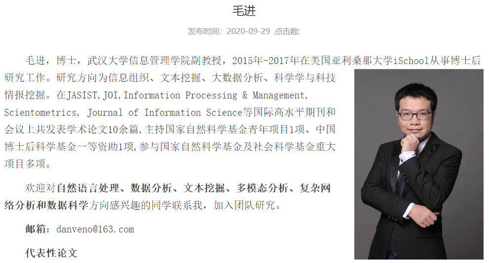 毛进,男,1988年3月生,博士,武汉大学信息管理学院副教授,2015年-2017年在美国亚利桑那大学iSchool从事博士后研究工作。研究方向为信息组织、文本挖掘、大数据分析、科学学与科技情报挖掘。在JASIST,JOI,Information Processing & Management, Scientometrics, Journal of Information Science等国际高水平期刊和会议上共发表学术论文10余篇,主持国家自然科学基金青年项目1项、中国博士后科学基金一等资助1项,参与国家自然科学基金及社会科学基金重大项目多项。