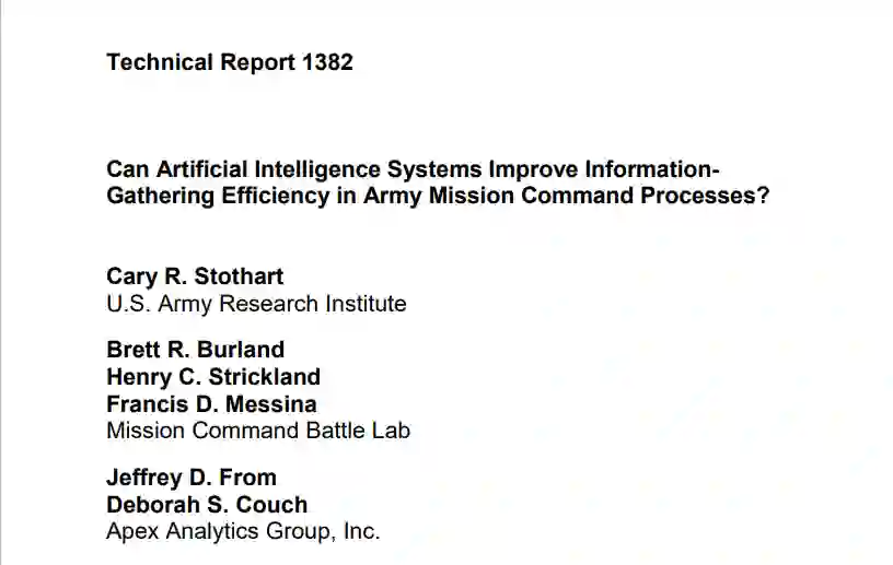 便捷下载,请关注专知人工智能公众号(点击上方蓝色专知关注) 后台回复“A39” 就可以获取《【美国陆军】《人工智能系统能否提高陆军任务指挥过程中的信息收集效率?》39页技术报告》专知下载链接