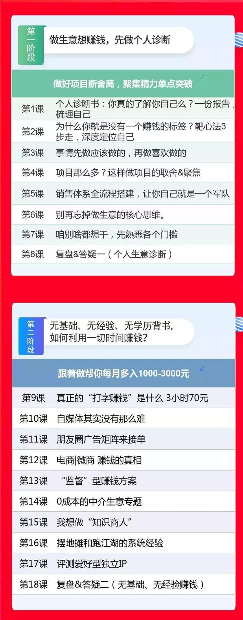 这个体系中包括“个人诊断”、“无基础、无经验、无学历背书”、“有基础、有经验、淡化学历背书”和“学习技能,再来赚钱”四个方面,一步一步教你每个赚钱项目的玩法。