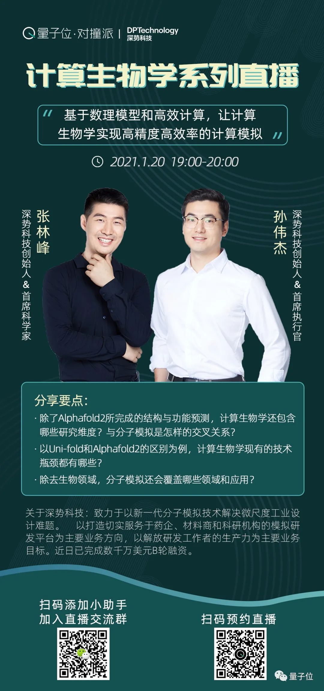 在第二场直播中,我们邀请到了深势科技的两位创始人张林峰和孙伟杰,基于分子模拟的通用底层技术来理解计算生物学。