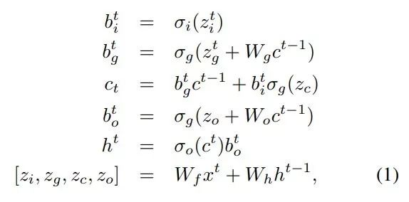 其中 t 是时间步,x 是输入,[z_i, z_g, z_c, z_o] 是连接起来的大小一致的四个向量,h 是 c 的输出,b_i、b_g 和 b_o 分别是输入门、遗忘门和输出门,σ_i、σ_g 和 σ_o 分别是输入激活函数、遗忘激活函数和输出激活函数,W_f、W_h、W_g 和 W_o 都是可学习的参数。(1)式的计算可有效地分为两个连续的步骤:隐藏模块