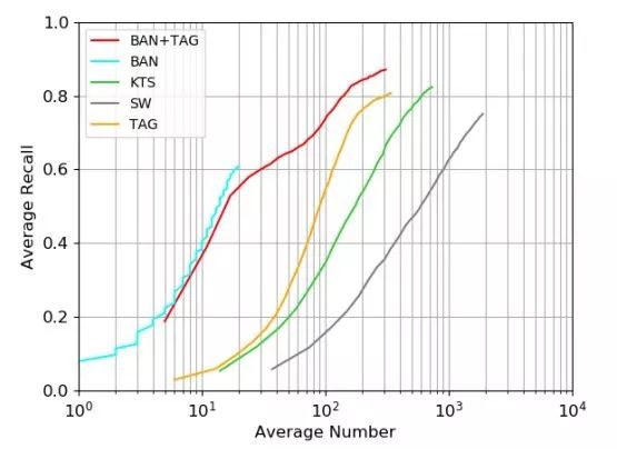 可以看到,当提议数量较小时,新提出 BAN 的平均回调指标(average recall)显著高于其它方法,但由于其选择标准,它不能生成其它方法那样多的提议。注意 TAG 和 BAN 是高度互补的,将它们的结果融合到一起可以得到明显更好的曲线。