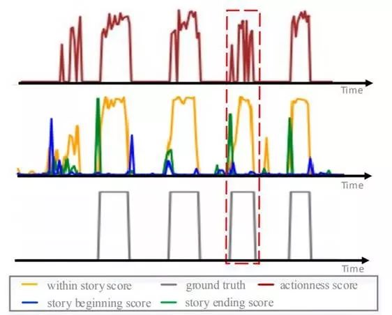 不同于之前仅依靠动作性质来生成提议的常用方法,BAN 利用了额外的帧级边界性质来生成提议。下图 5 展示了 TAG [30](上排)与新提出的 BAN(中排)的动作性分数的比较。