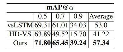 研究者还将新提出的框架与当前最佳视频摘要方法进行了比较,包括 vsLSTM [36] 和 HD-VS [33]。结果见下表 6。