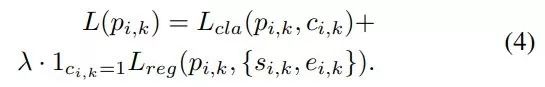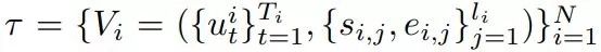 其中帧级特征 u 来自长视频 V_i,其对应于一个 ground-truth 的切片式短视频集。{s_{i,j} , e_{i,j}} 是 V_i 的第 j 个区间的起始和结束索引。N 是训练视频的数量,T_i 是 V_i 的帧数量,l_i 是 V_i 的区间数量。