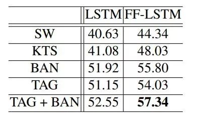 不同于之前的最佳方法(这些方法的提议生成仅取决于动作性质),BAN 使用了额外的帧级边界性质来生成提议,这能在提议数量较小时实现更高的精度。而且,不同于用于序列建模的传统 LSTM,FF-LSTM 引入了连接堆叠的 LSTM 层的快速前向连接,从而能在深度循环拓扑结构(deep recurrent topology)中助力实现稳定高效的反向传播,进而提升视频故事分类的效果。