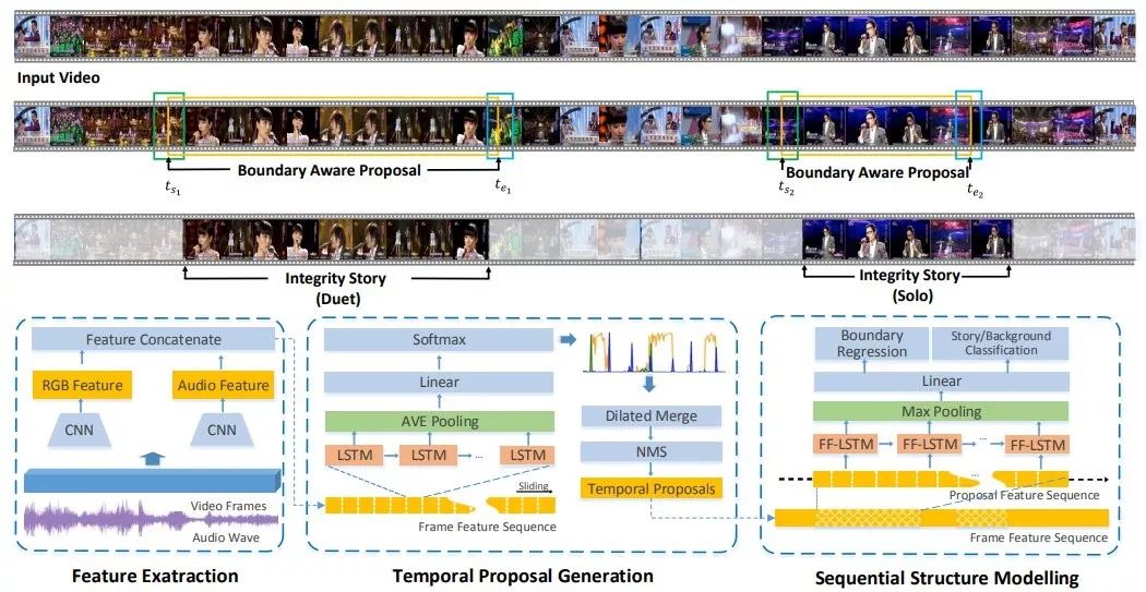 给定一段输入的长视频,先提取出基于 RGB 的 2D 卷积特征和音频特征,并将它们连接起来。在时间提议生成组件中,将这些特征输入 BAN,预测每帧的吸引力和边界性质。然后执行一个扩张融合算法(dilated merge algorithm),根据帧级的吸引力和边界性质分数生成时间提议。在序列结构建模组件中,通过 FF-LSTM 建模每个提议的序列结构,这能输入提议的分类置信度分数以及经过细化微调的边界。