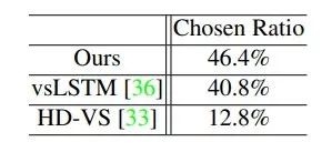 可以看到,新提出框架生成的故事摘要收到了 46.4% 的投票,高于 vsLSTM(40.8%)和 HD-VS(12.8%)。