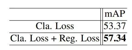 下表 5 总结了回归损失的控制变量研究结果。可以看到,增加回归损失实现了近 4.0 的 mAP 提升。