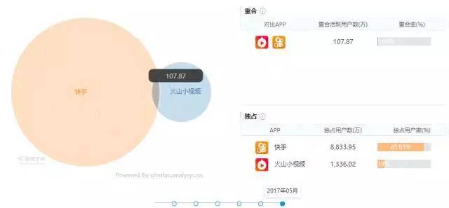 根据易观千帆这份截止到 2017 年 5 月的数据,头条光火山小视频这个独立出去的项目就在数据上达到快手八分之一的量级,更别提抖音这匹今年短视频平台最大的黑马在高阶用户上对快手进行收割。