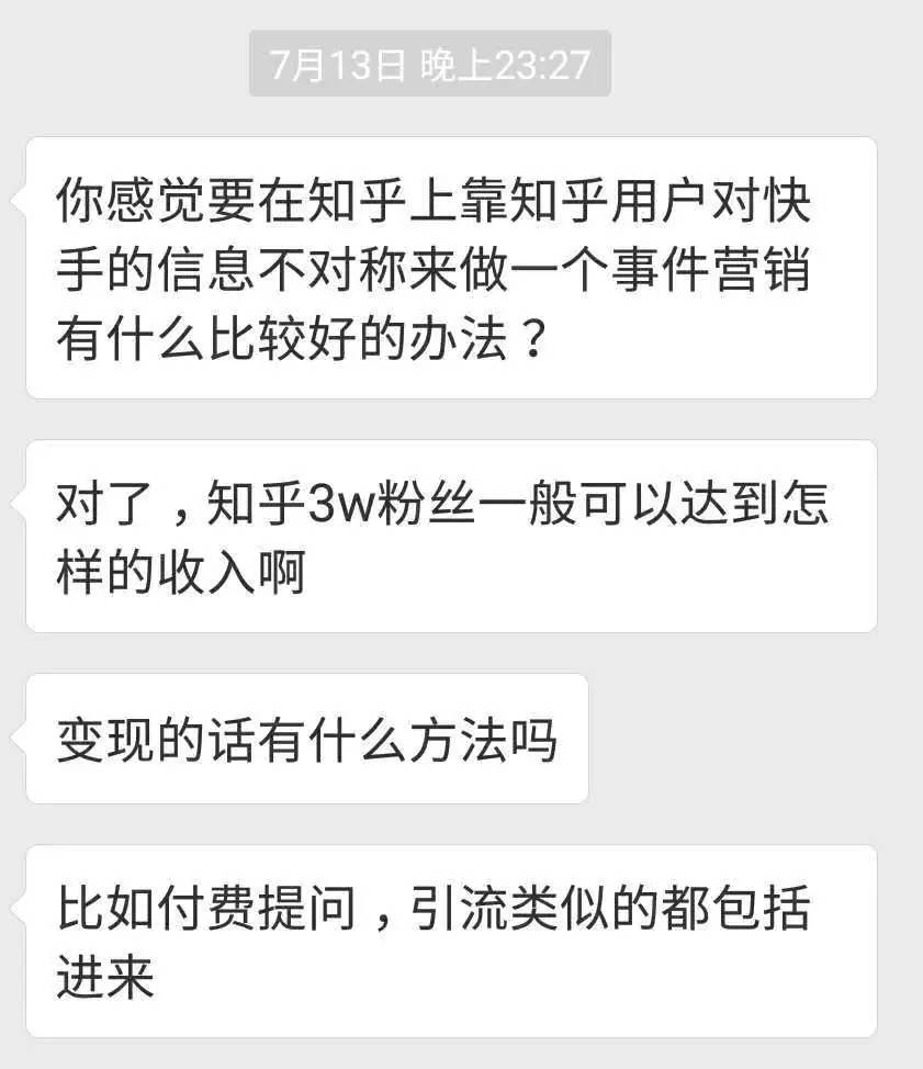 大概在一周前,我和在快手上拥有 130 万粉丝的一个大号团队交换了微信,一顿寒暄后,这位直播收入每天在三四千、短视频广告费用能到六七千的富豪,又问了我一连串关于在知乎上怎么变现的问题: