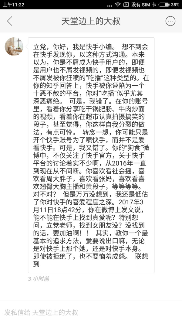 一名快手员工发现了那位曾斥责快手妖魔化农村的知乎用户相对应的快手ID,并以自己的个人账号,发送出这样的私信: