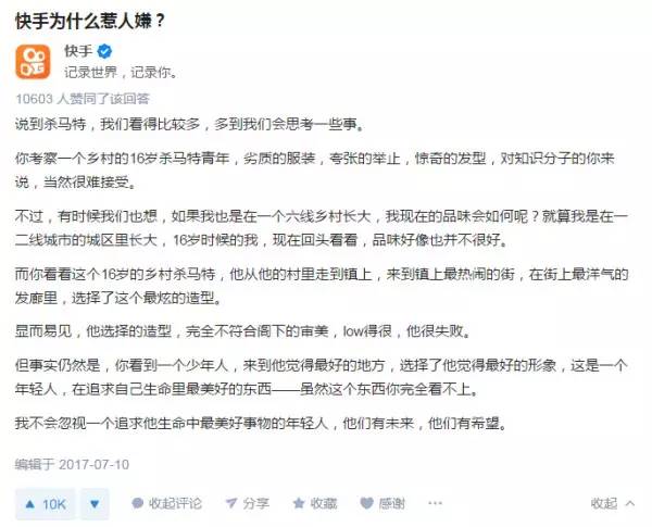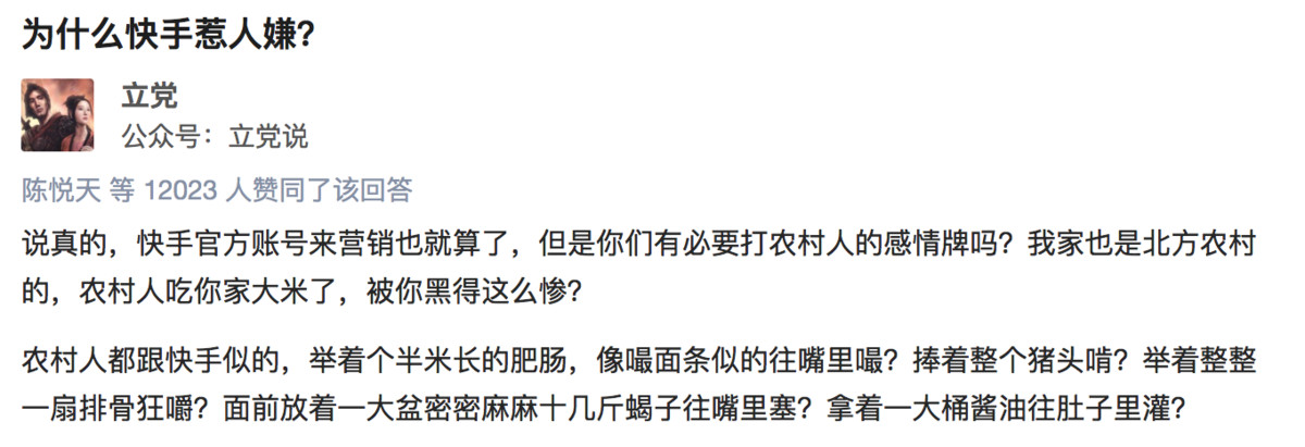 可以说,知乎的用户们并不反对快手作为表达底层真实生活平台的价值,但是对于快手上过多呈现的博眼球式妖魔化农村的现象,非常反感。