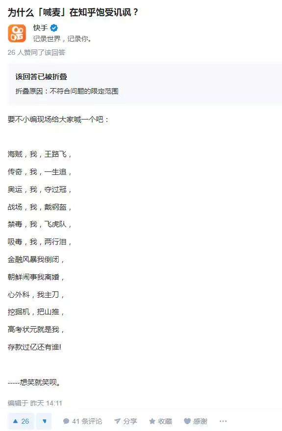 比如用喊麦的方式讽刺知乎平台曾经的劣迹(很快被知乎官方折叠)。