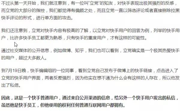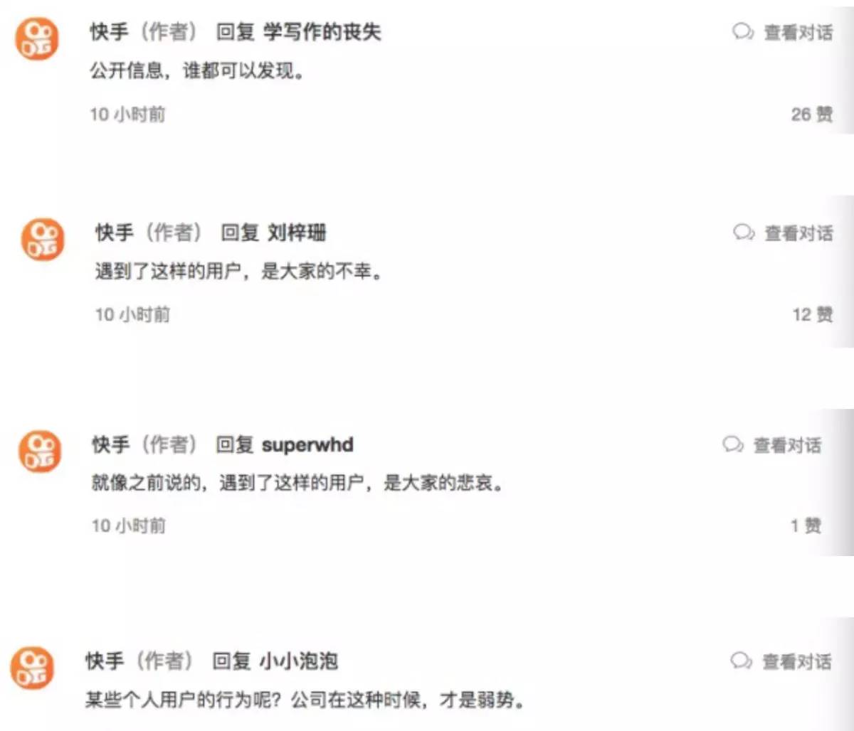 在事件被曝光后,快手被扣上了公开用户个人信息的帽子,但快手在官方回应中表示,员工获取用户信息的方式来自公开信息,并认为,“虽然他是快手员工,但他使用的权利任何普通互联网用户都拥有”。