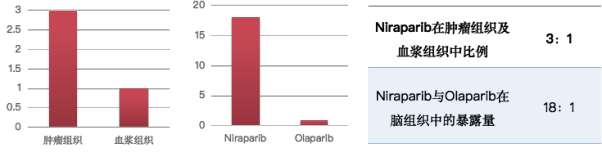 Niraparib的一个特点是肿瘤暴露量是血浆暴露量的3倍多,这与临床情况下Niraparib的分布是一致的。Niraparib脑组织中的暴露量大约是Olaparib的18倍。此外,在难治性的BRCAwt模型和颅内模型中,即使Niraparib在较低剂量下也比Olaparib获得更强的抑制肿瘤生长作用。