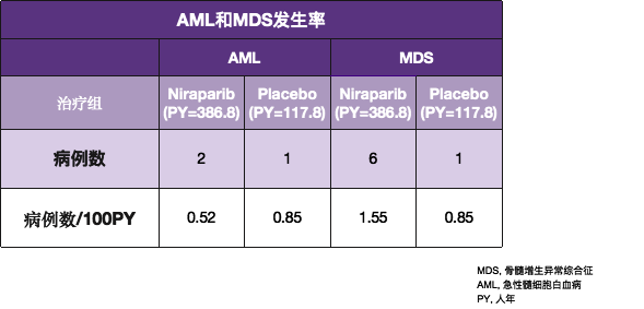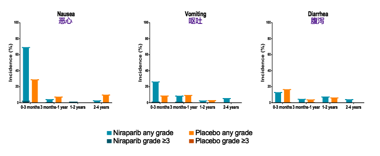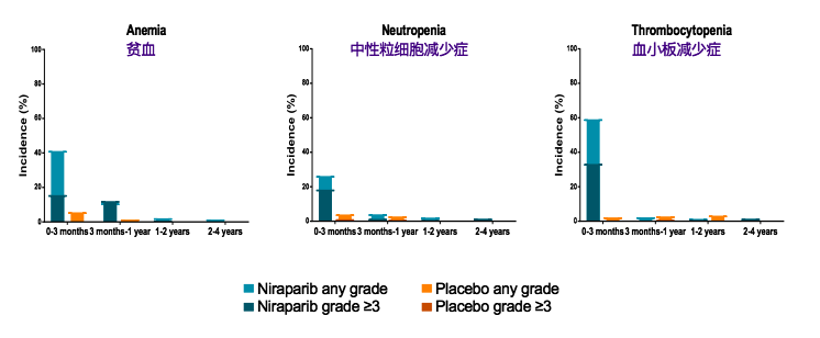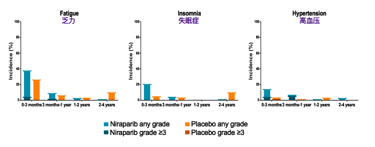 Niraparib维持治疗显示了良好的长期耐受性。血液系统相关AE更频繁地发生在早期,大多数 AE(任何等级和等级≥3肠胃,疲劳和失眠)在前3个月通过剂量调整就可以缓解。血液和胃肠相关AE,疲劳和失眠在3个月后是罕见的。在1年后,≥3级贫血的发生率降低到小于1%。