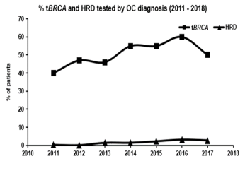 统计显示,2011 - 2018年间,tBRCA检出率有所提高。所有4950位 OC患者约有50%进行了tBRCA检测。tBRCA检测的OC患者中,22%为突变(tBRCAmut),75%为野生型(tBRCAwt)。总的来说,HRD测试并不常见。