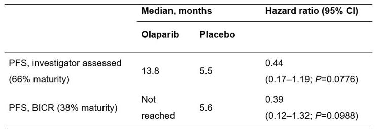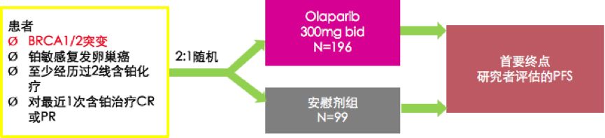 SOLO2评估口服PARP抑制剂olaparib 在PSR OC和BRCA1/2突变(BRCAm)患者中的疗效。奥拉帕尼比安慰剂显示有统计学意义的PFS改善,耐受性良好。此次单独对的中国SOLO2患者进行了分析。主要终点是研究者评估的PFS (RECIST v1.1)。采用盲法独立中心复查(BICR)对PFS进行敏感性分析。