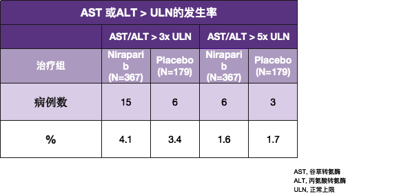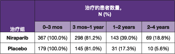 长期耐受性在维持治疗中至关重要。NOVA研究中经Niraparib治疗的相当一部分患者显示出长期应答。经过剂量调整后的Niraparib显示出很好的长期耐受性,包括接受治疗时间大于3年的患者。长期治疗中,Niraparib与安慰剂的TEAEs发生率相似。NOVA研究为Niraparib的剂量个体化方法以及长期安全使用提供了支持依据。
