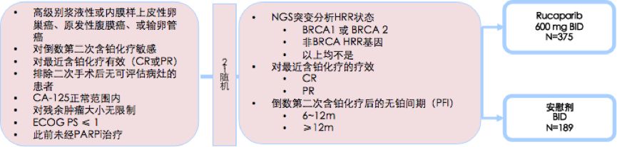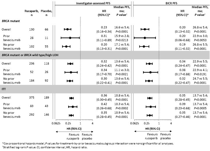 Rucaparib对比安慰剂显著改善了所有患者群体中PFS,且不需要考虑生物标志物的状态。本探索性亚组分析了先前贝伐珠单抗治疗对研究者评估和盲法独立中心评估PFS的影响。曾使用贝伐珠单抗作为上一次治疗或更早治疗的患者允许入组(贝伐珠单抗的使用并不是分层因素)。PFS在3个预定义的队列中进行评估:BRCA突变;BRCA突变或BRCA野生型/杂合子丢失(LOH高);以及意向治疗人群。有效性和安全性数据的截止日期分别为2017年4月15日和2017年8月15日。