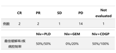 结果:在20例患者中,2例对纳武单抗完全缓解(未应用其他化疗),且完全缓解后没有复发。其余18例则出现疾病进展。其中5例没有化疗,但接受了最佳的支持治疗,其余患者则在应用纳武单抗后接受PLD(n=4),GEM(n=5),CDGP(n=2)及其他化疗。其中2例部分缓解,1例疾病稳定,9例疾病进展及1例未评估。PLD、GEM、CDGP的最佳反应率/疾病控制率分别为50%/50%, 0%/20%, 50%/100%。
